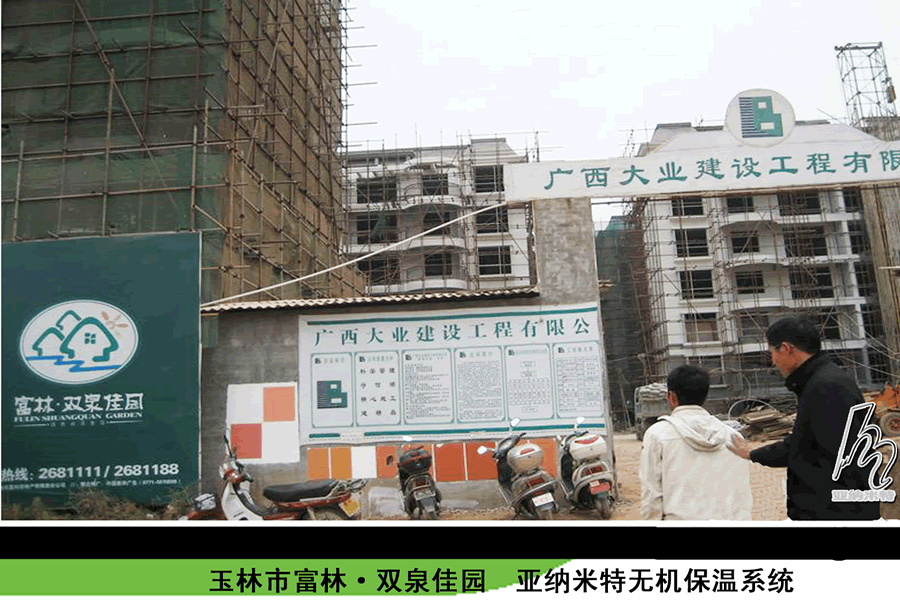 玉林市富林雙泉佳園,使用材料新型隔熱保溫材料,施工面積:20000平方米,施工部位:外墻